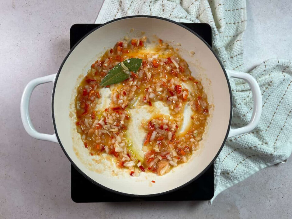 To make the sofrito sauce, put the oil in a saucepan and add the onion, the pepper, the garlic, and the chopped tomatoes. Season with the bay leaf, salt, cumin, crushed red pepper (chilli), and marjoram (or thyme).